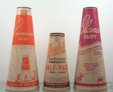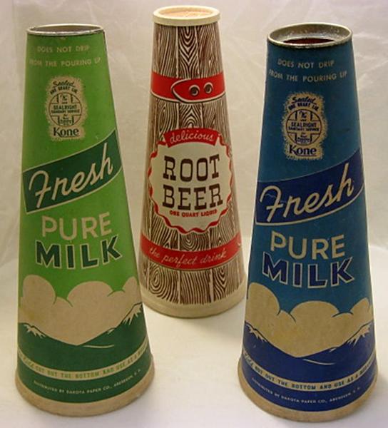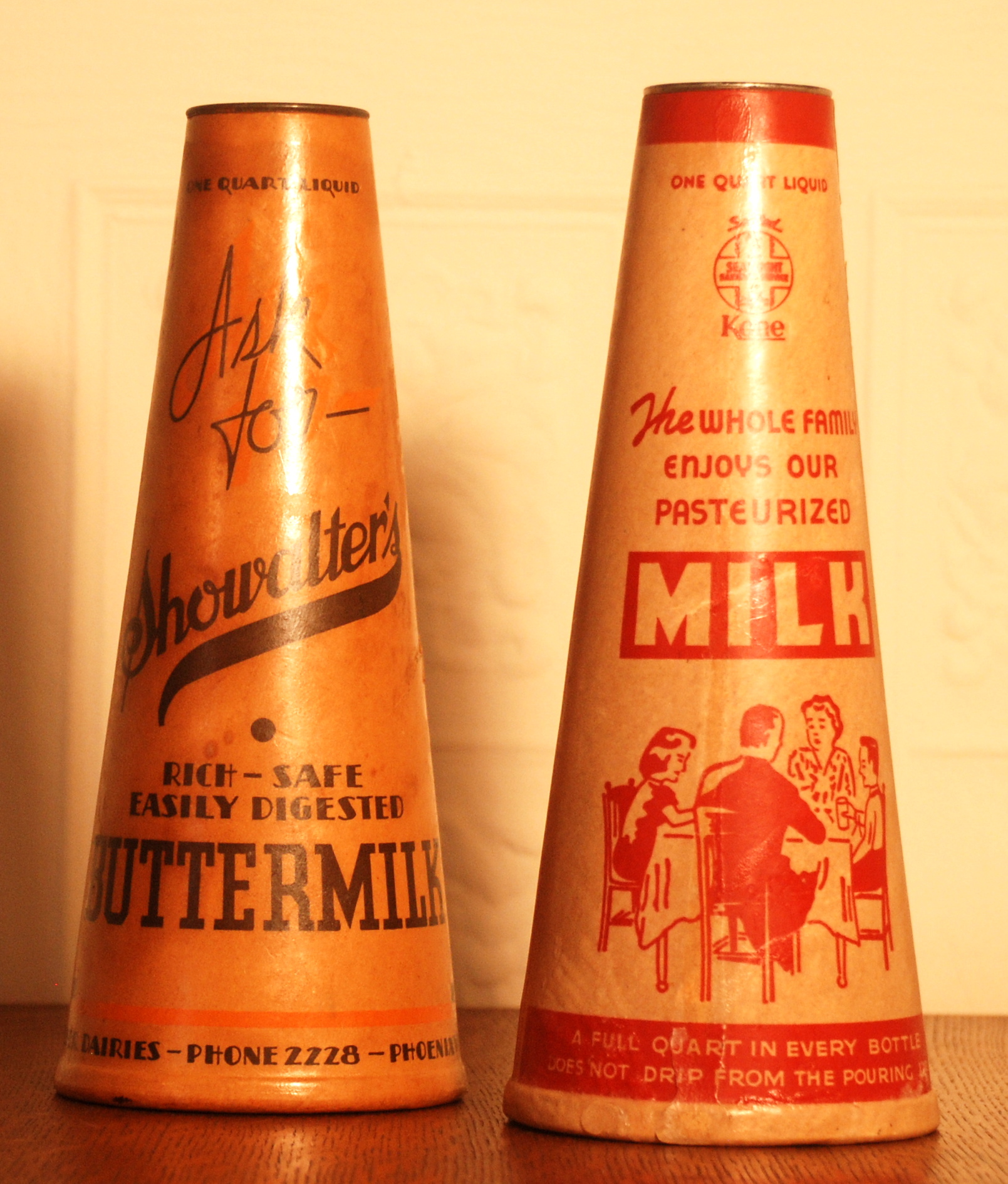 Wax Milk containers or cones from the 1930s to the 1950s are among my favorite collectibles. They are graphic, charming and easy to display. Not limited to milk, I have seen some great apple cider and orange juice ones. We still often buy our milk and juice in waxed paper containers today- not cone-shaped, of course, and not so great-looking as some of these examples. Click here for more info on the history of milk containers.