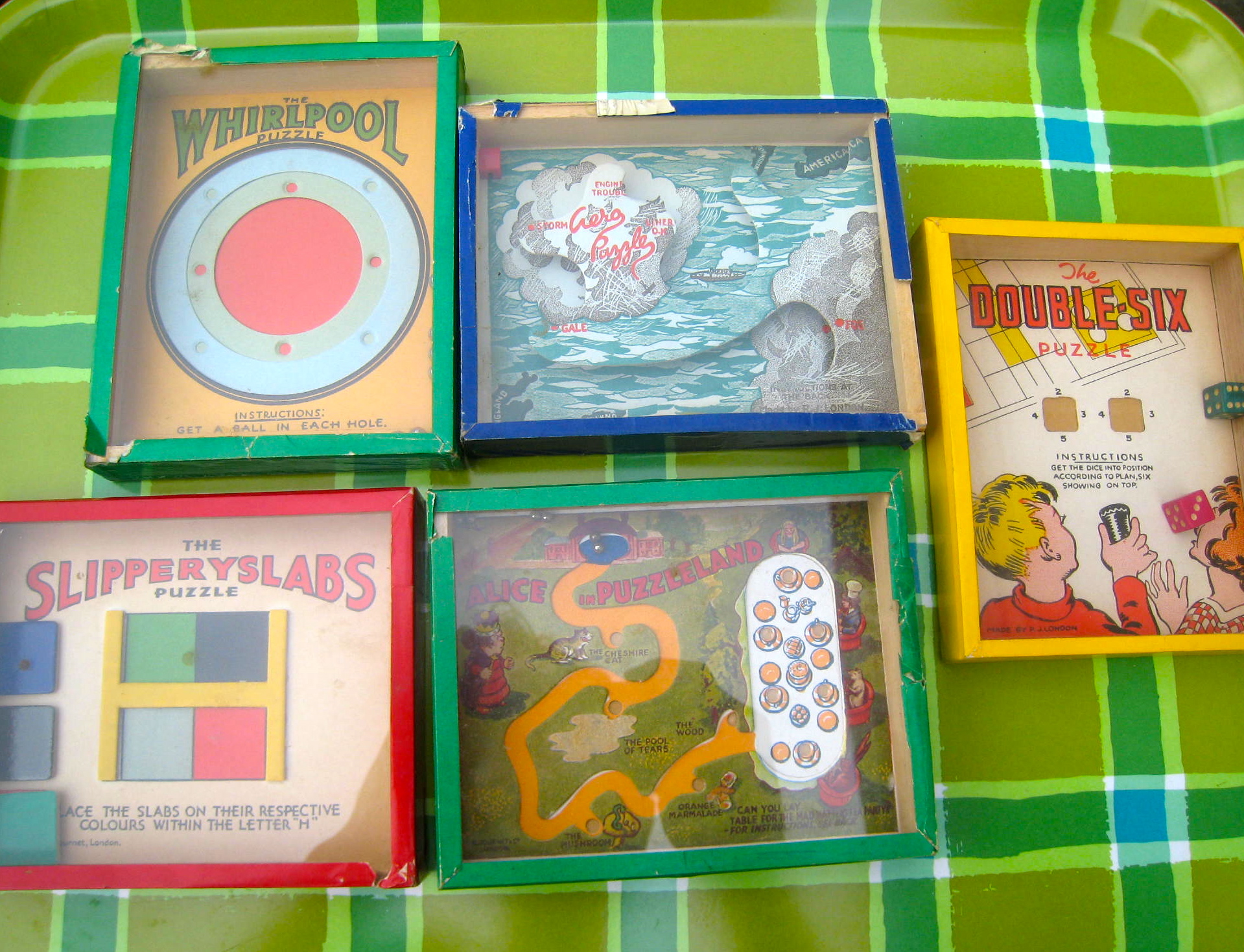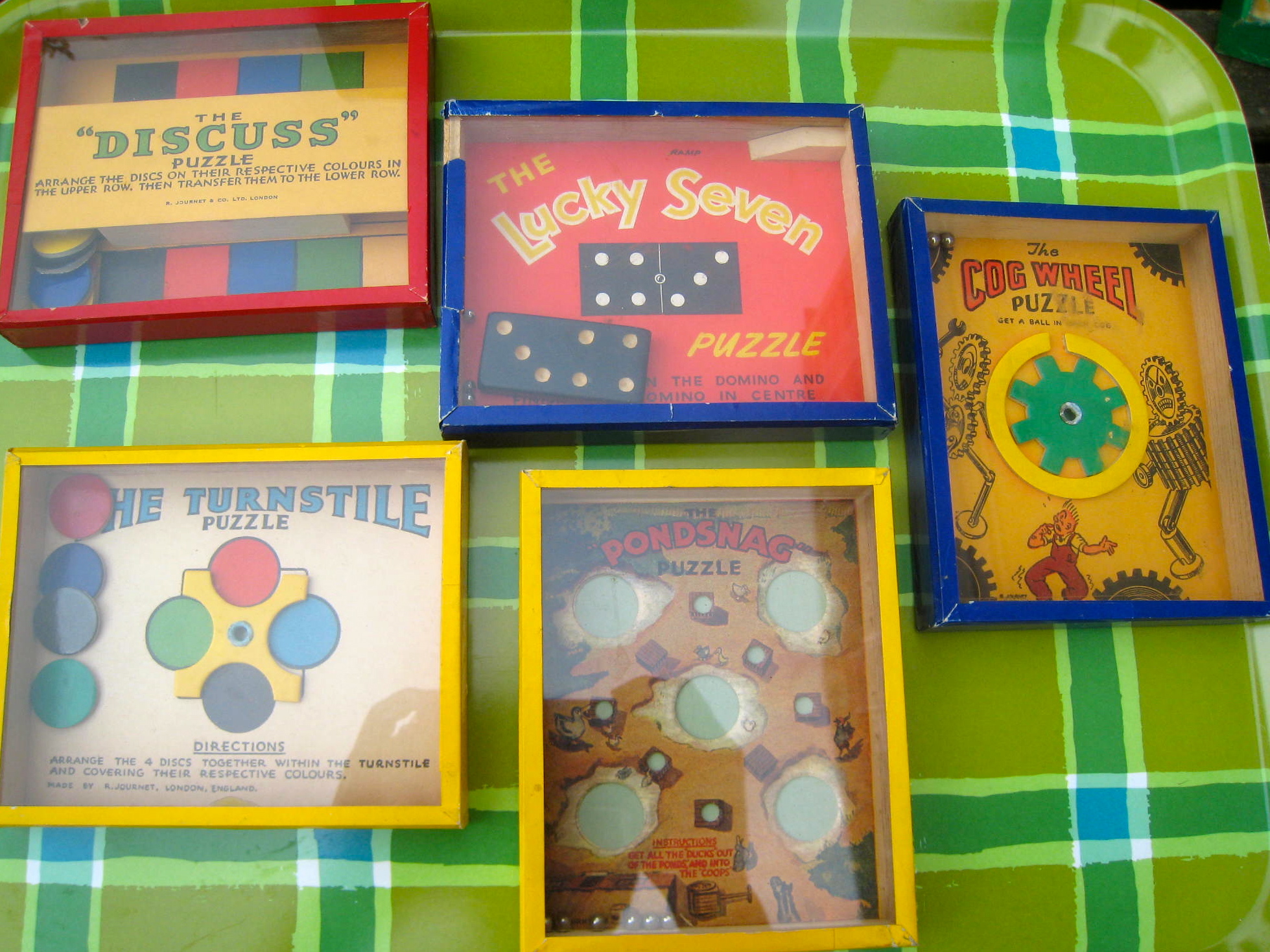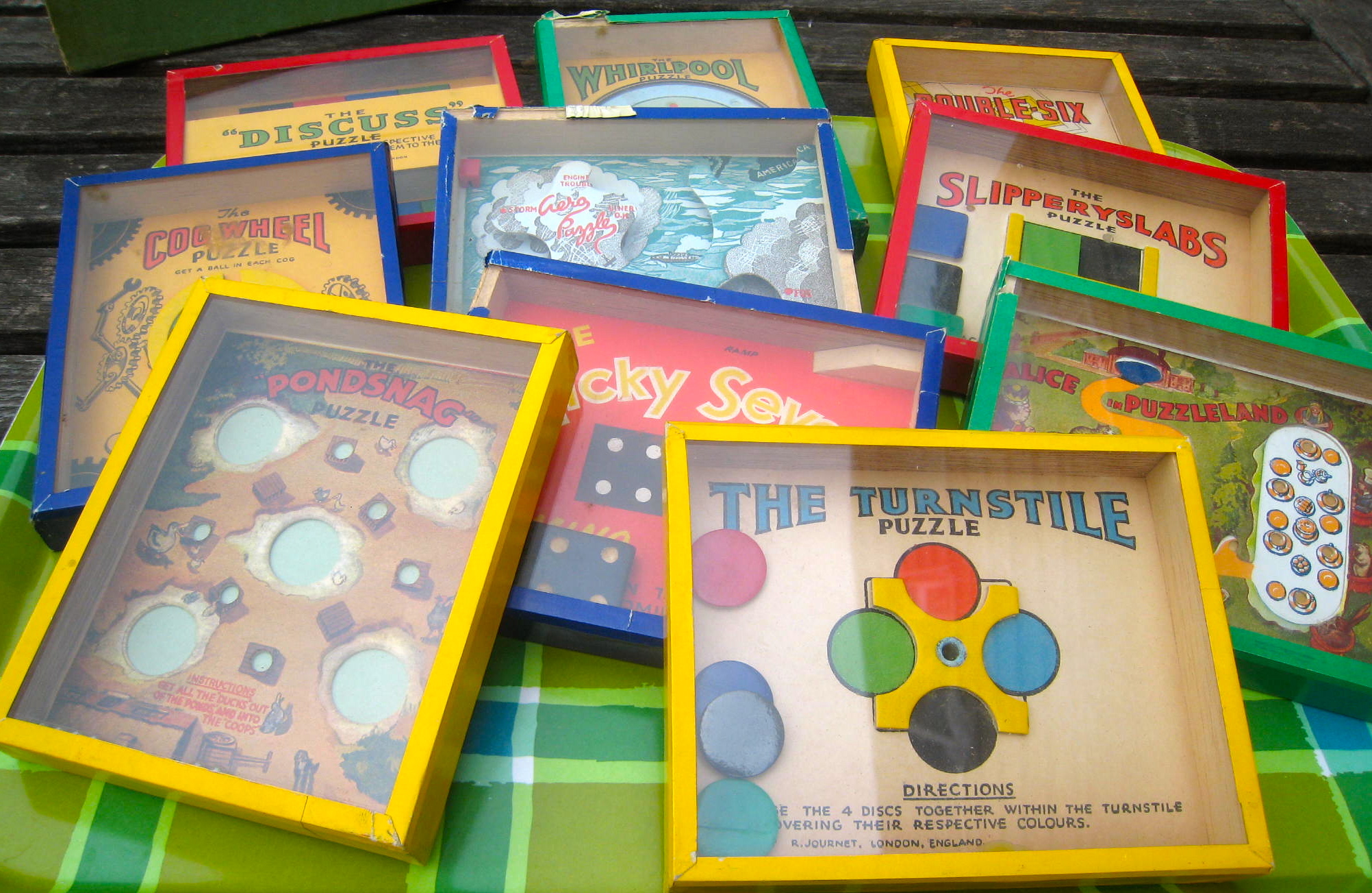 Here are some lovely antique games that I found recently at an estate sale. I did a bit of research and found out that they were made by an English company named R. Journet. The Company is best known for producing compact, boxed, dexterity puzzles. They challenged the player to move items or ball bearings through mazes, obstacles and traps with the aim of accurately positioning these items in pre-determined locations or holes.