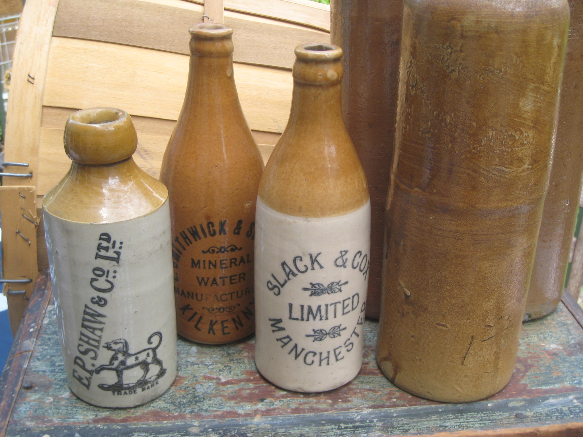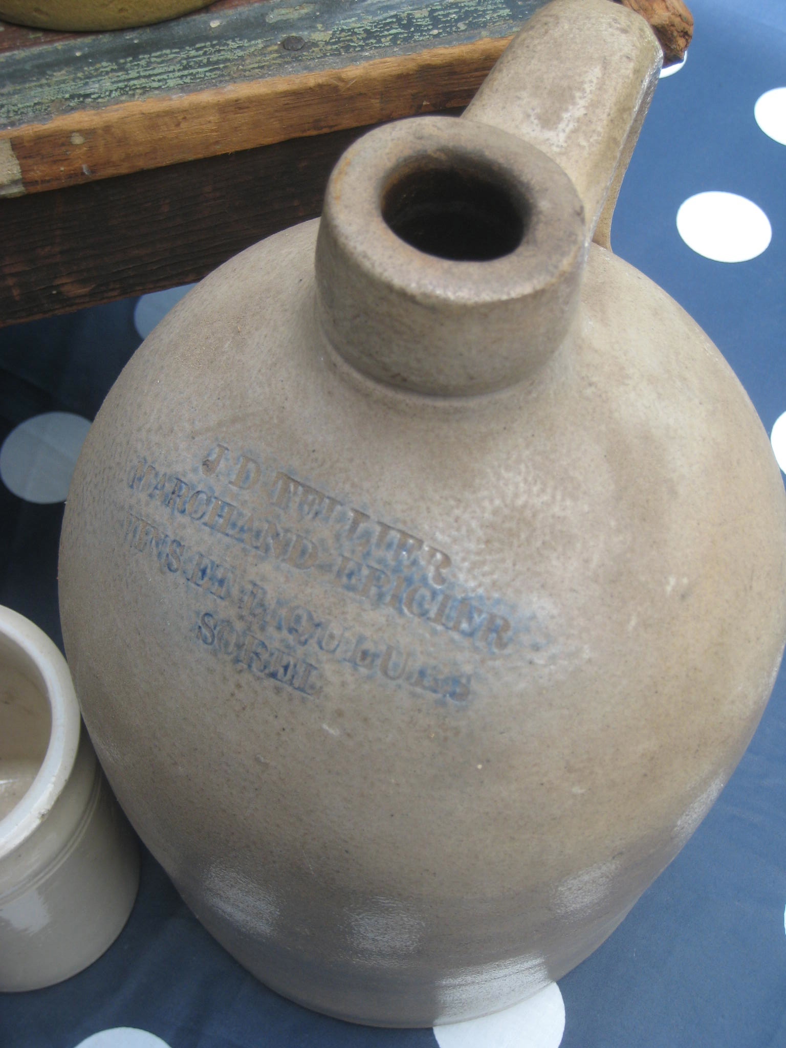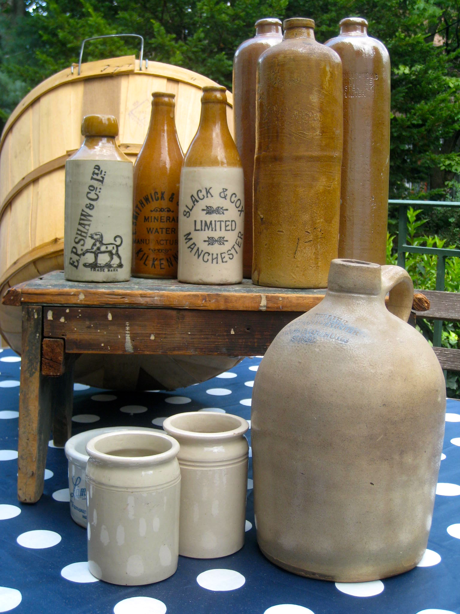 I am loving the look of these antique salt-glazed stoneware bottles and crocks- especially the three bottles with the advertising. These date back to the end of the 19th Century and hail from England, Ireland and Canada. Also in the photo are three gin bottles from Amsterdam and a large wine jug in the front from France or Belgium. A few little marmalade crocks and a butter crock round out the group. I love the pocked surface and iridescence of the salt glaze, the natural creams, golds and browns and handmade forms of these pieces.