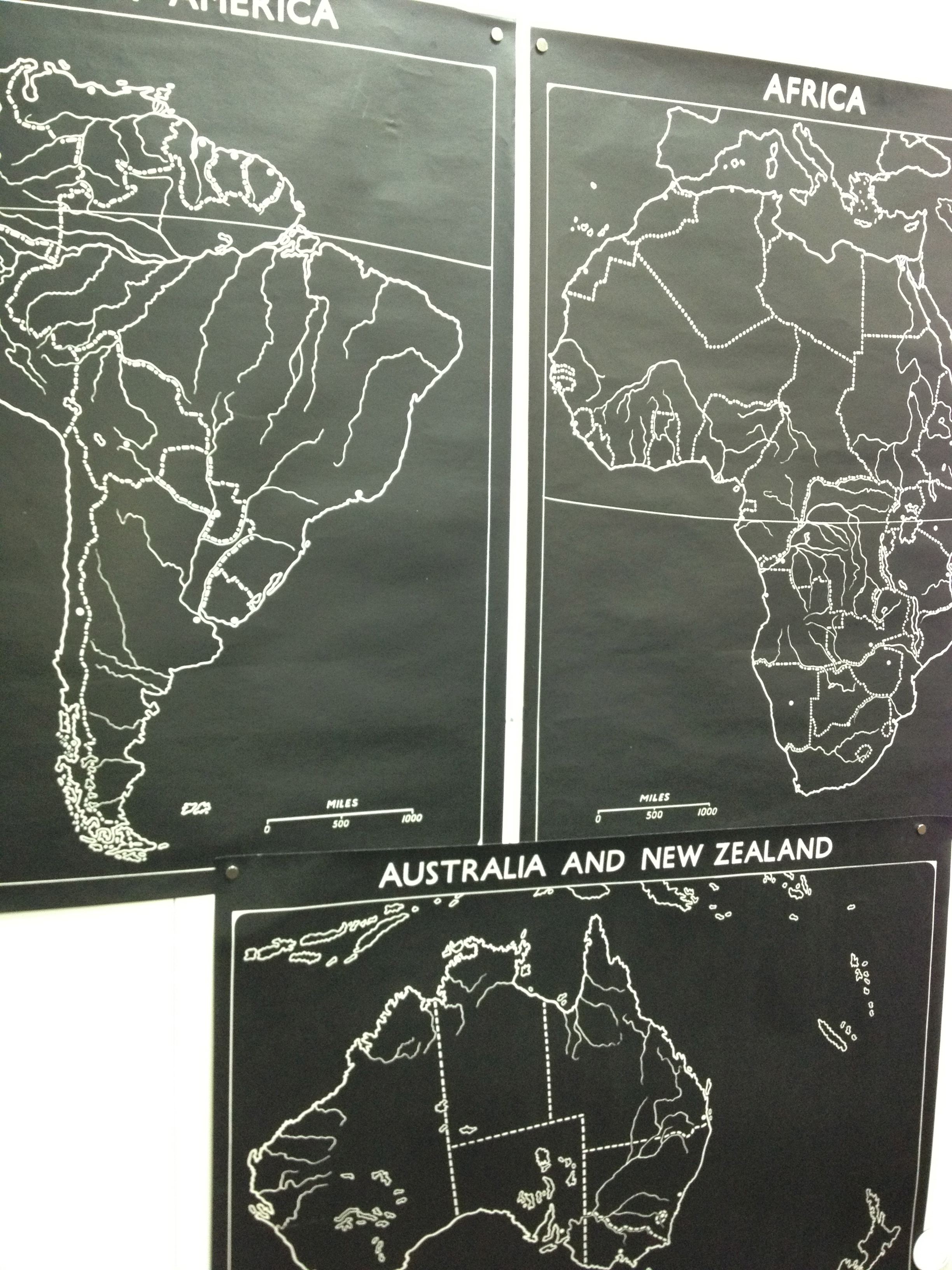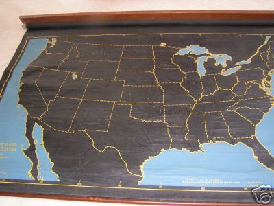 Among my favorite educational maps and charts are those that are "slated" or have a blackboard surface. They are often referred to as chalk plates. These were designed to be written on in chalk by the instructor and wiped clean with a damp cloth. The graphics were usually very simple and clear- often just an outline. The simplicity of these maps and charts can be very artful and interesting. Chalk plates are relatively rare and difficult to find. Many are worn and cracked from being written on and wiped off countless times in the classroom.