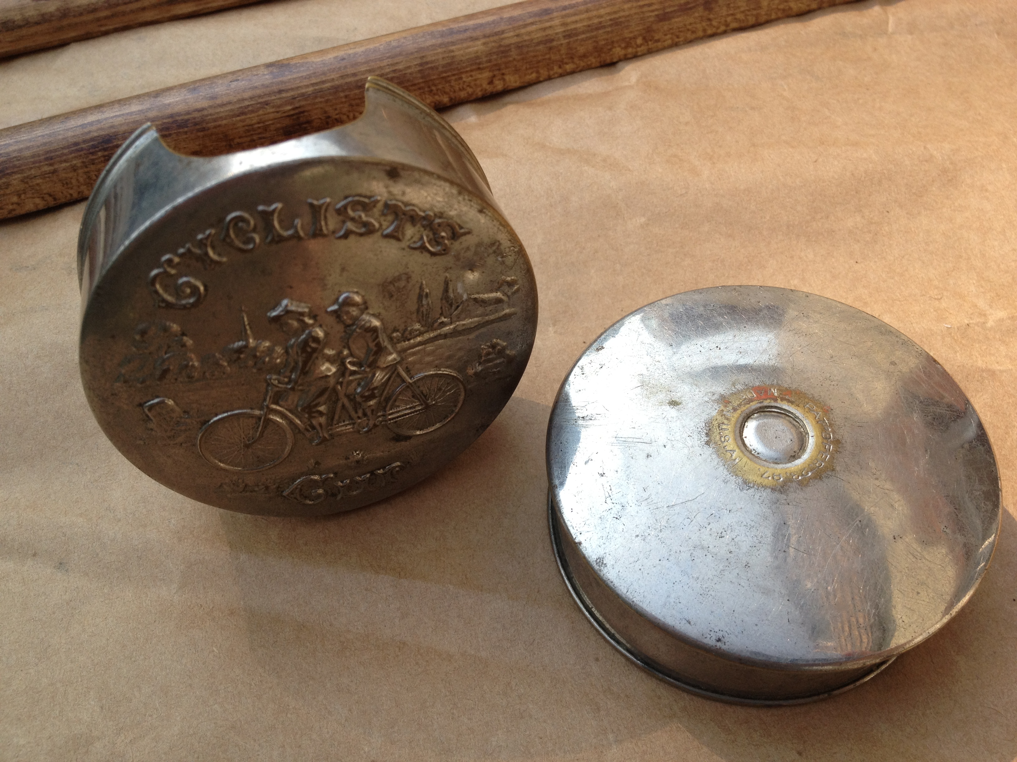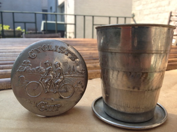 This is a unique collectible for the cycling enthusiast. It was created in 1897 and was carried as a portable cup. It is a "telescoping" collapsible silver cup. The style was patented on February 23, 1897 by John Lines. This particular cup is embossed on the lid. It says Cyclist's Cup. There is an image of two people riding a tandem bicycle (bicycle-built-for-two.) It was made in the U.S.A. It is a somewhat rare item and is worth about $75 if you can find one.