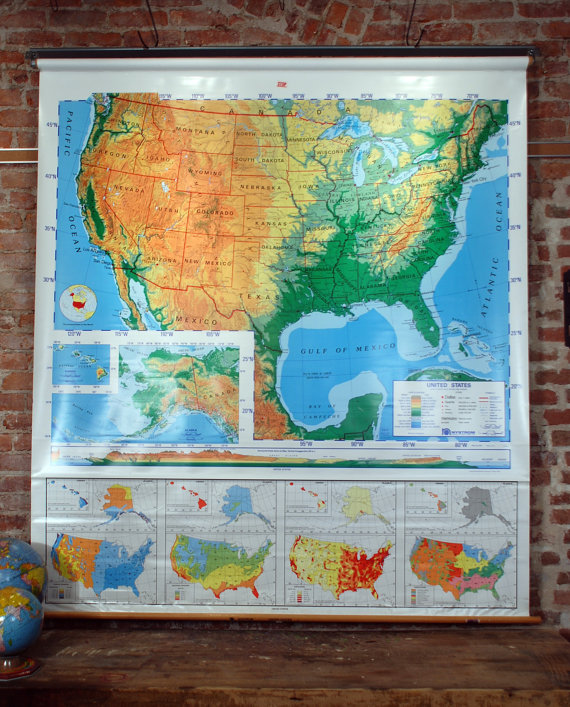 Well….I could do this all day- it's pretty fun, but just one more. I like the way the map is taken off the metal bracket- partially unrolled and hung with a ribbon. You could accomplish a similar look with the very long U.S. map for sale in my etsy shop.