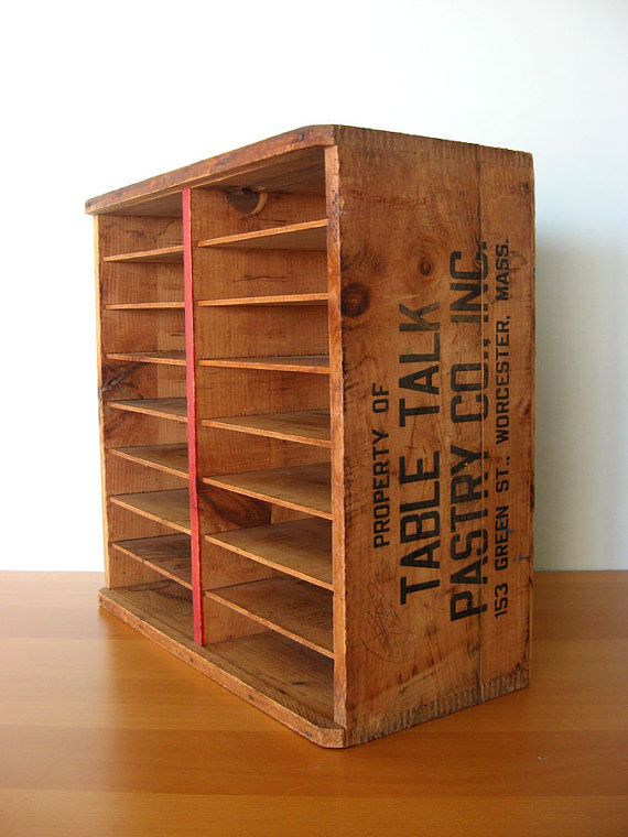 I will be bringing a few other things in this same vein to the flea tomorrow: An original wooden, dovetailed store pie crate for Table Talk pies ($95). It will not be the same one in the photo below, but very, very similar. Put on a tabletop to hold your pie tins or mount on the wall to organize papers.