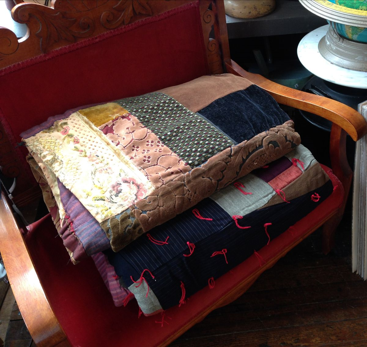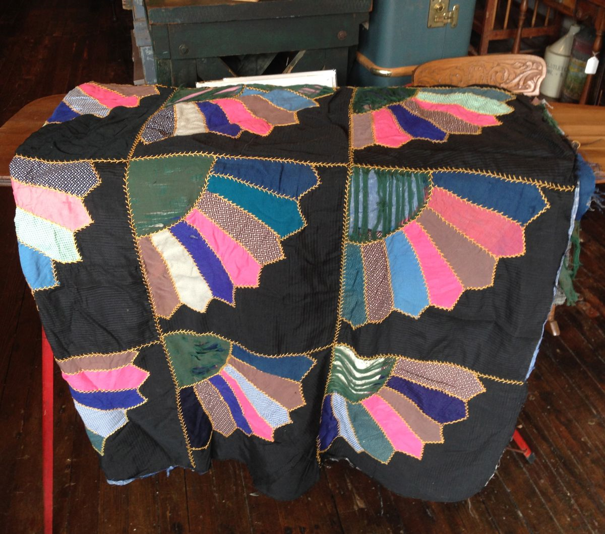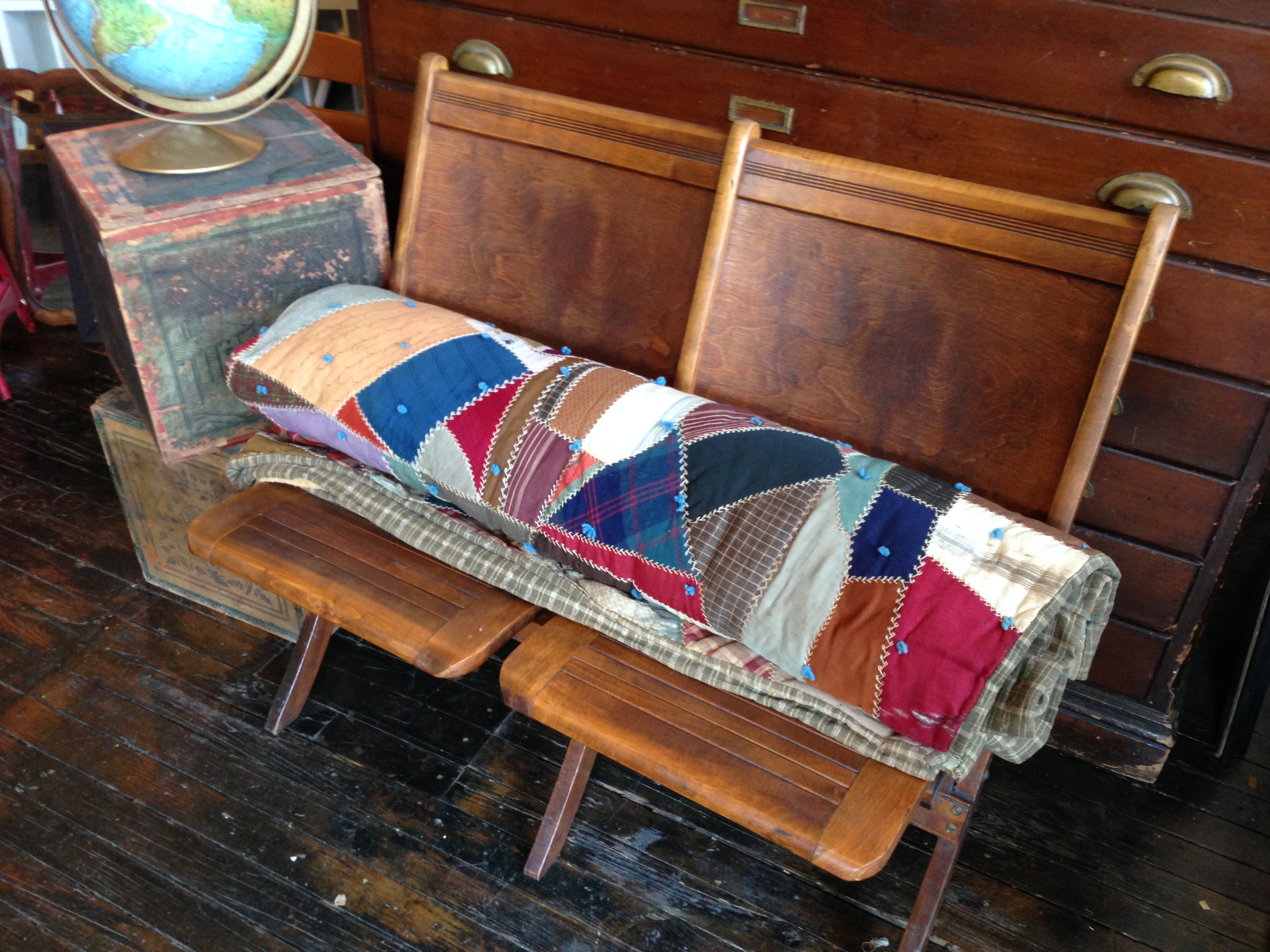 I have always been inspired by so-called "ugly" quilts and patchworks made from cast-off textiles- mens' wool suiting, scraps of bright silk, ticking, feed sack and upholstery fabric. Condition is often an issue with these hodge podge quilts. Wools and silks tend to fray before the sturdier cottons. I find them to still be beautiful and I have several great examples for sale. They can be hung on the wall behind a bed or sofa for a great and graphic effect.