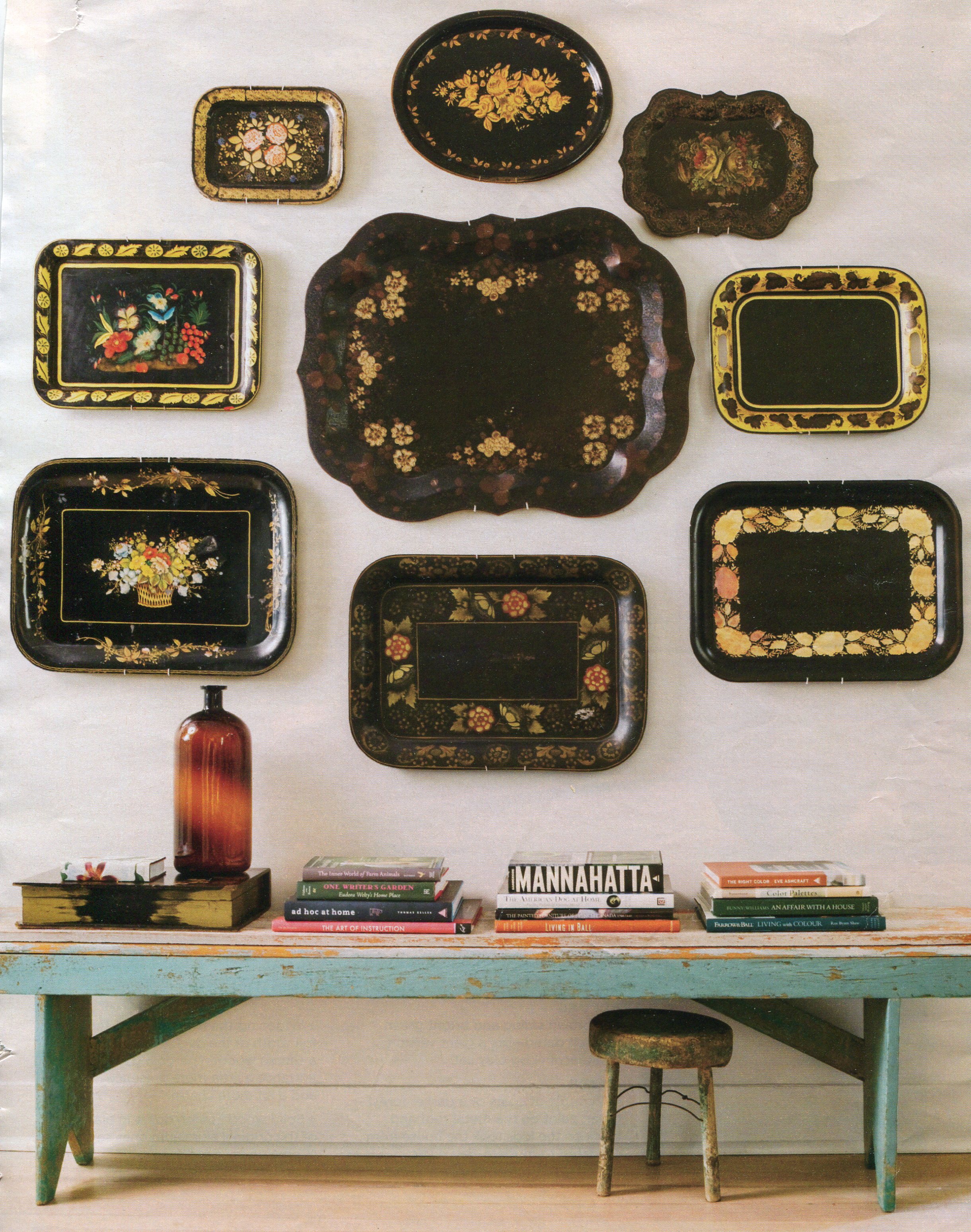 The crazy quilts put me in mind of some other complimentary items. Amber apothecary glass, tole painted trays, warm wood and some lovely color frameable color prints of European folk art patterns.