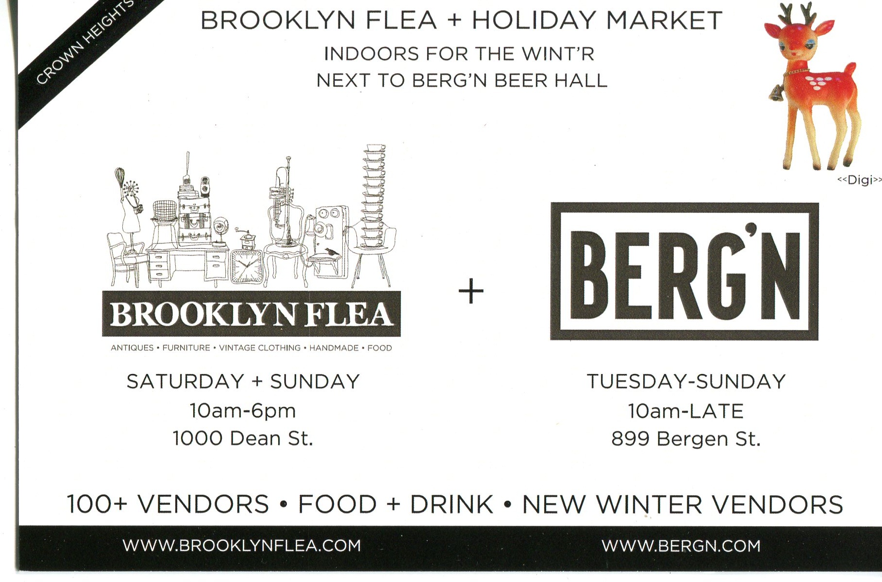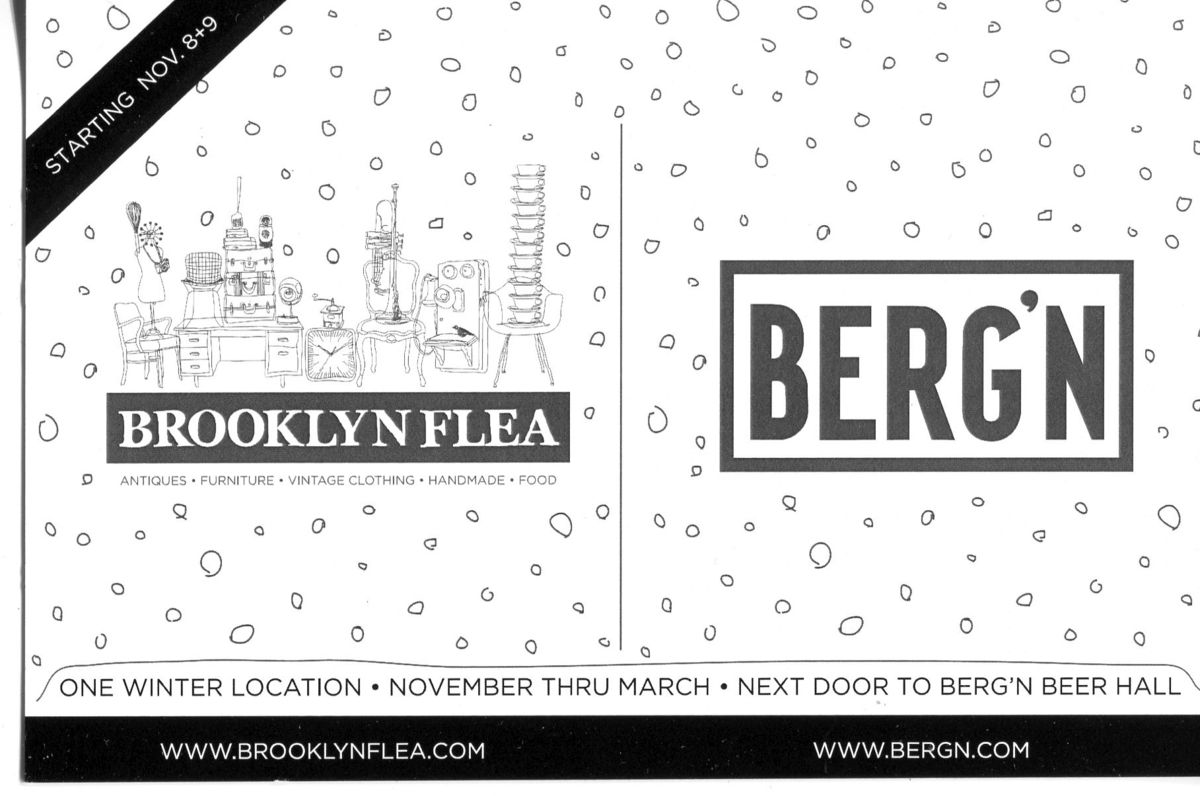 Starting November 8+9, our operation moves indoors for the annual Winter Flea + Holiday Market, to a single Brooklyn location: 1000 Dean (btw. Classon + Franklin Ave.), which just so happens to be directly connected to our new beer hall, Berg’n. (Stroke of luck, that.) Just off Franklin Ave., the 30,000+sf space (sneak peek below) is in the heart of Crown Heights, close to the 2/3 and C trains. (Take both to Franklin Ave.: the 2/3 at Eastern Parkway, the C at Fulton St.)