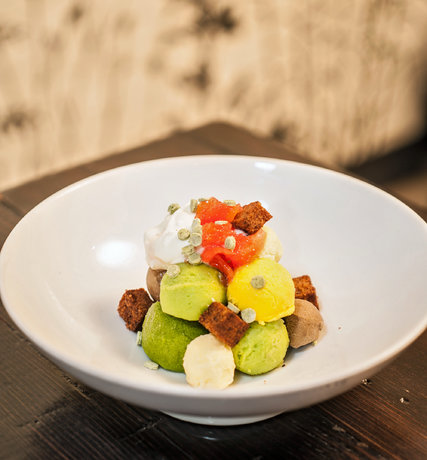 The above photos feature a flavor bomb of herbal stir-fry sauce and a vegetable ice cream salad, courtesy of Dirt Candy (an expanding vegetable-inspired East Village restaurant).