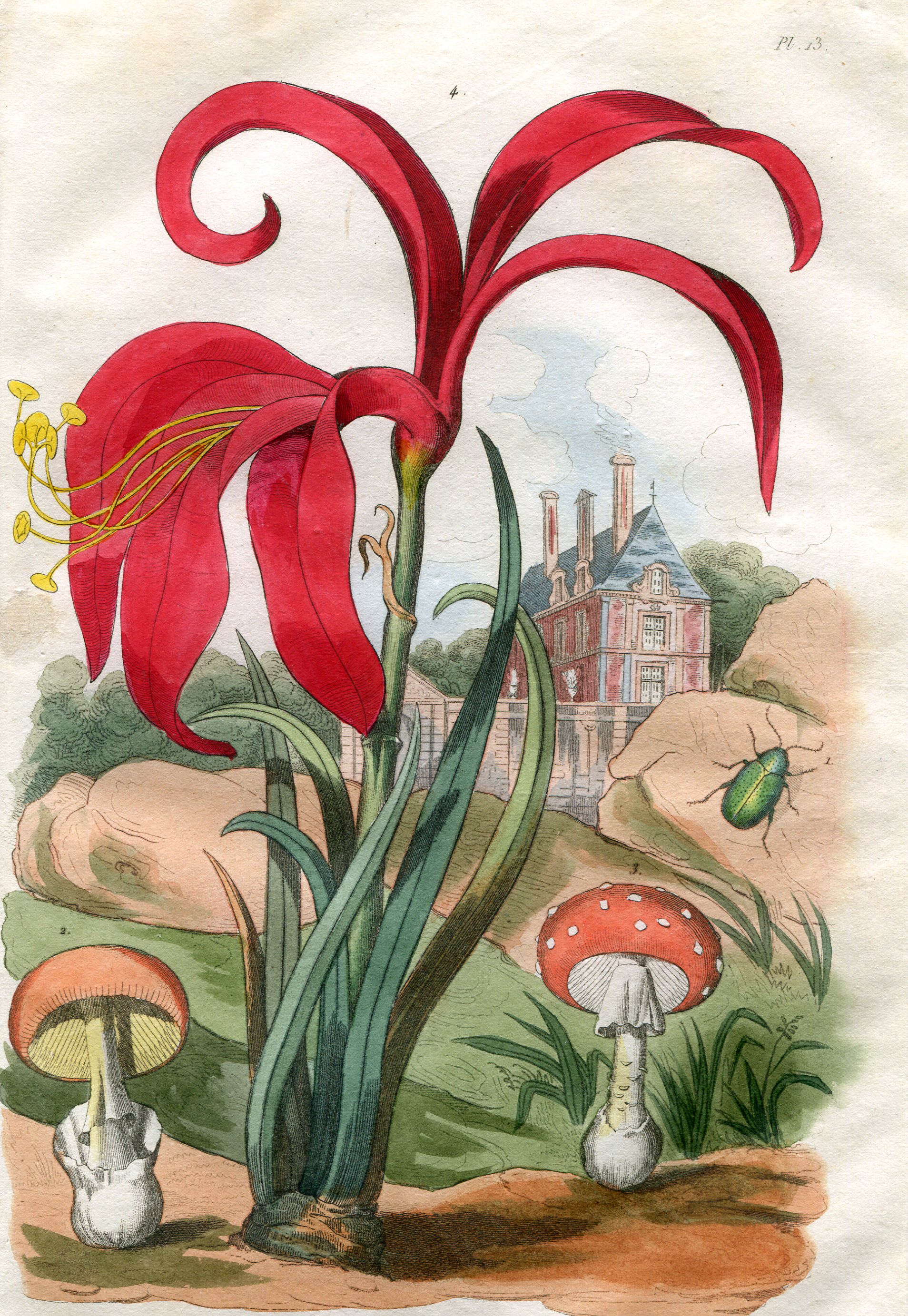 And for those who just want a little bit of flora, I have some fine original prints suitable for framing. The hand-colored English ferns (shown above), date back to the 1860s. The vivid hand-colored lily (shown below) is from Guerin, 1830s (French).