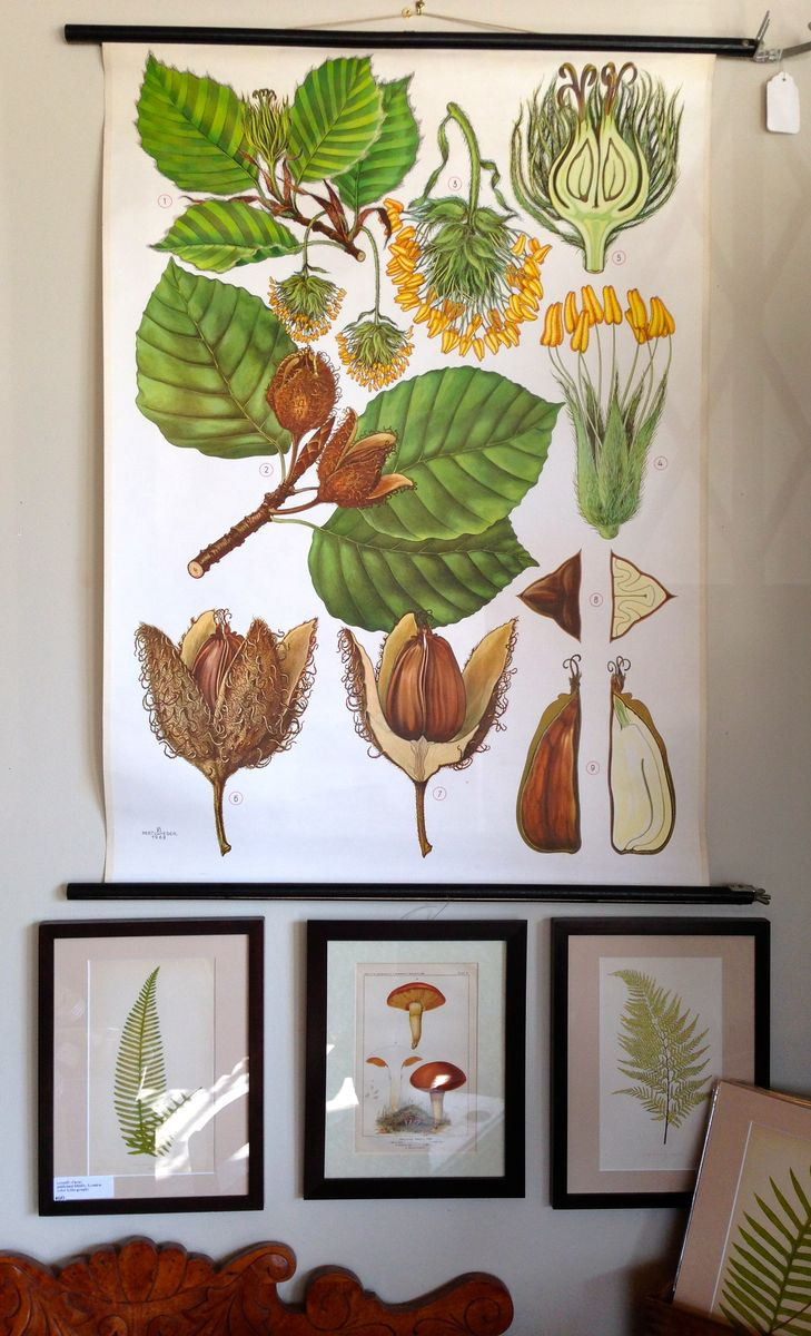 Among my favorite recent acquisitions are these generously-sized German botanical prints (excerpts below) from the 1870s. Hand-colored and exquisitely detailed, they evoke nature and radiate warmth. They could help chase away the winter blues. Matted and ready for 16 x 20 frames, $42 each.
