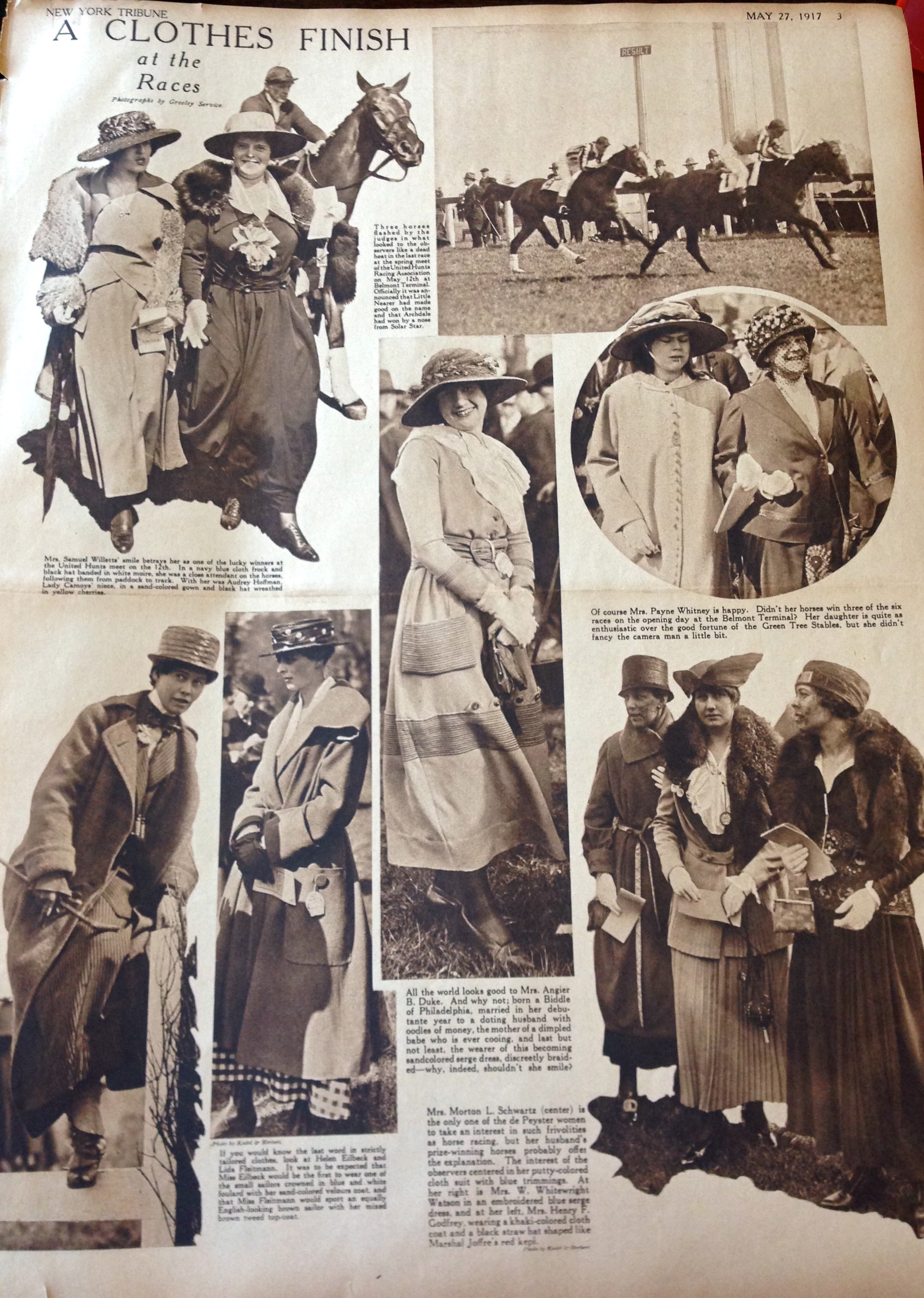 I found a nearly century-old 1917 page from The New York Tribune featuring a day at the Belmont races. Some very fun fashions on display.