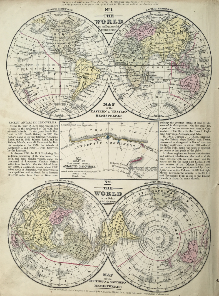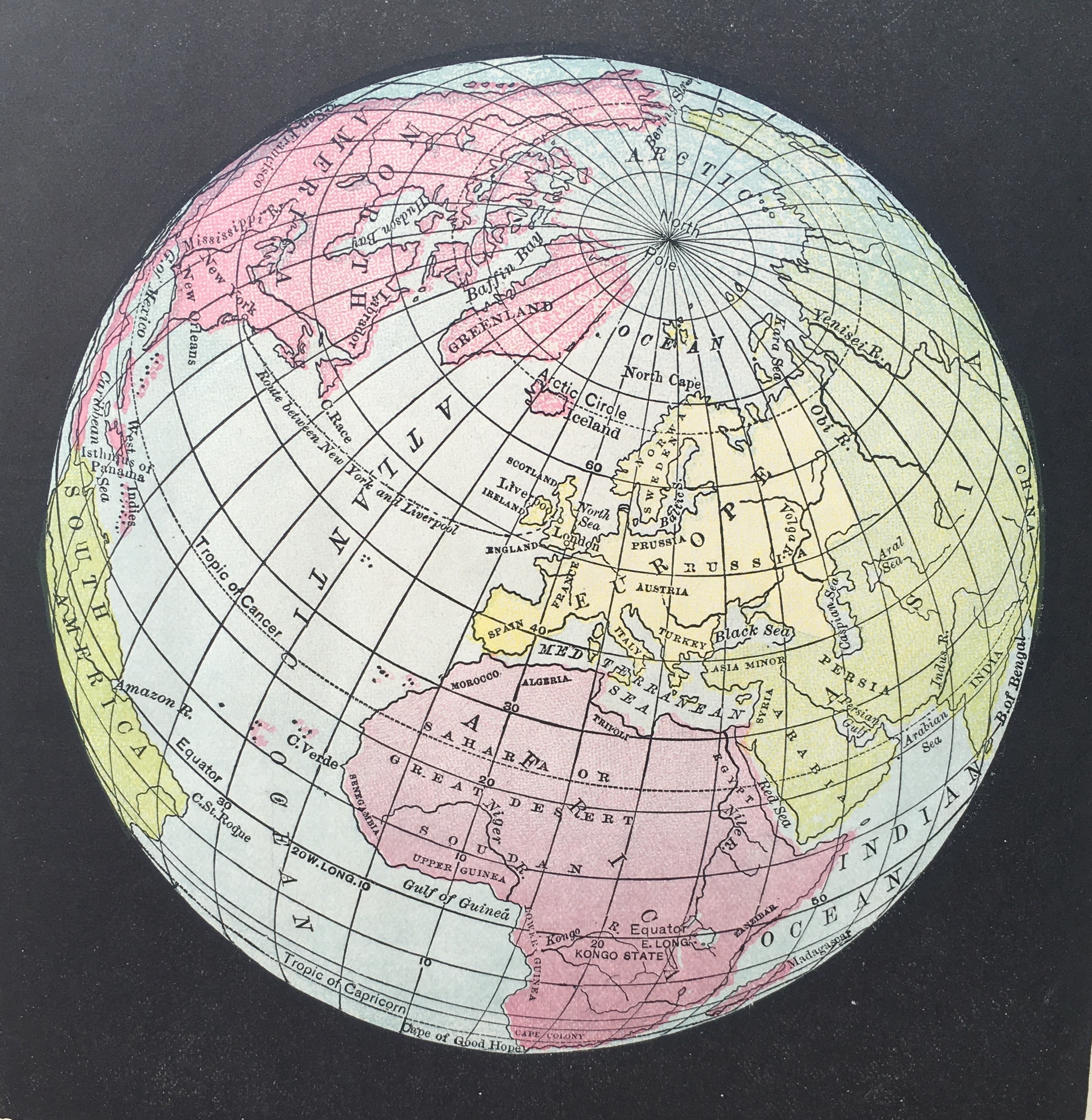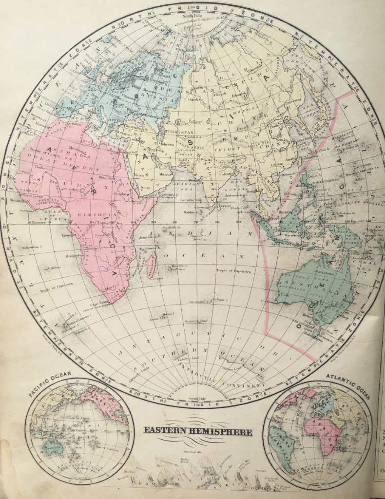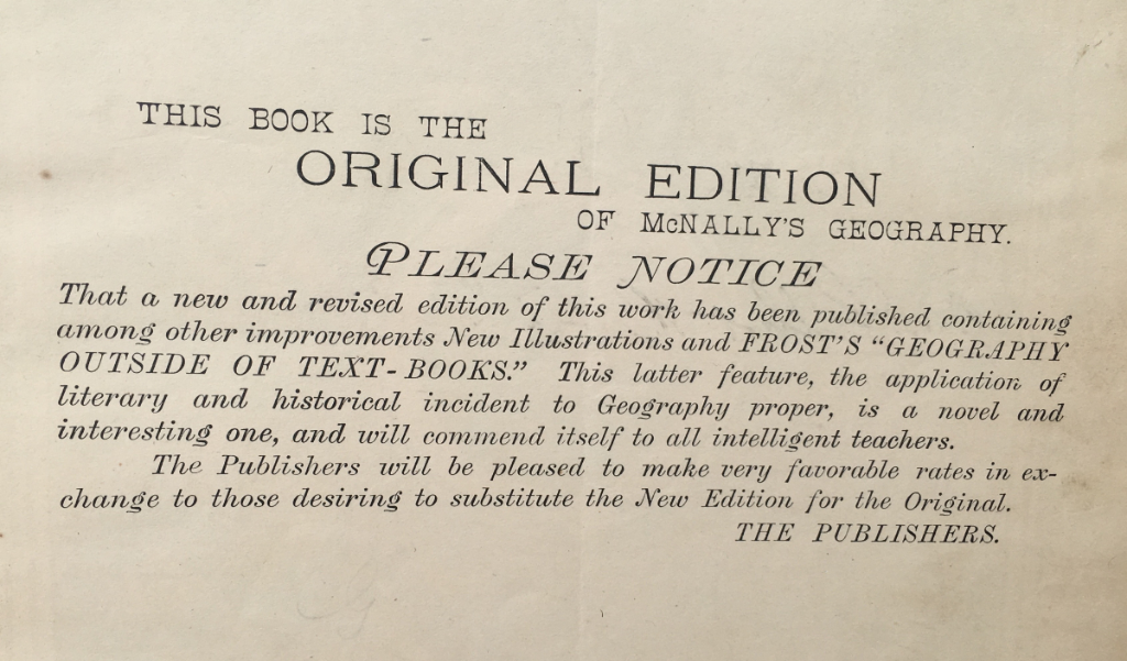 In general, I'm able to pick up very, very old examples of school atlases or geography primers (I have one dating back to 1819) for quite reasonable prices at auction. Many are made by highly esteemed map makers- such as Augustus Mitchell– whose larger atlases can fetch very high prices. I recently acquired a 1st edition of McNally's System of Geography from the 1840s. This company went on to become Rand McNally and to produce millions of school maps and atlases.