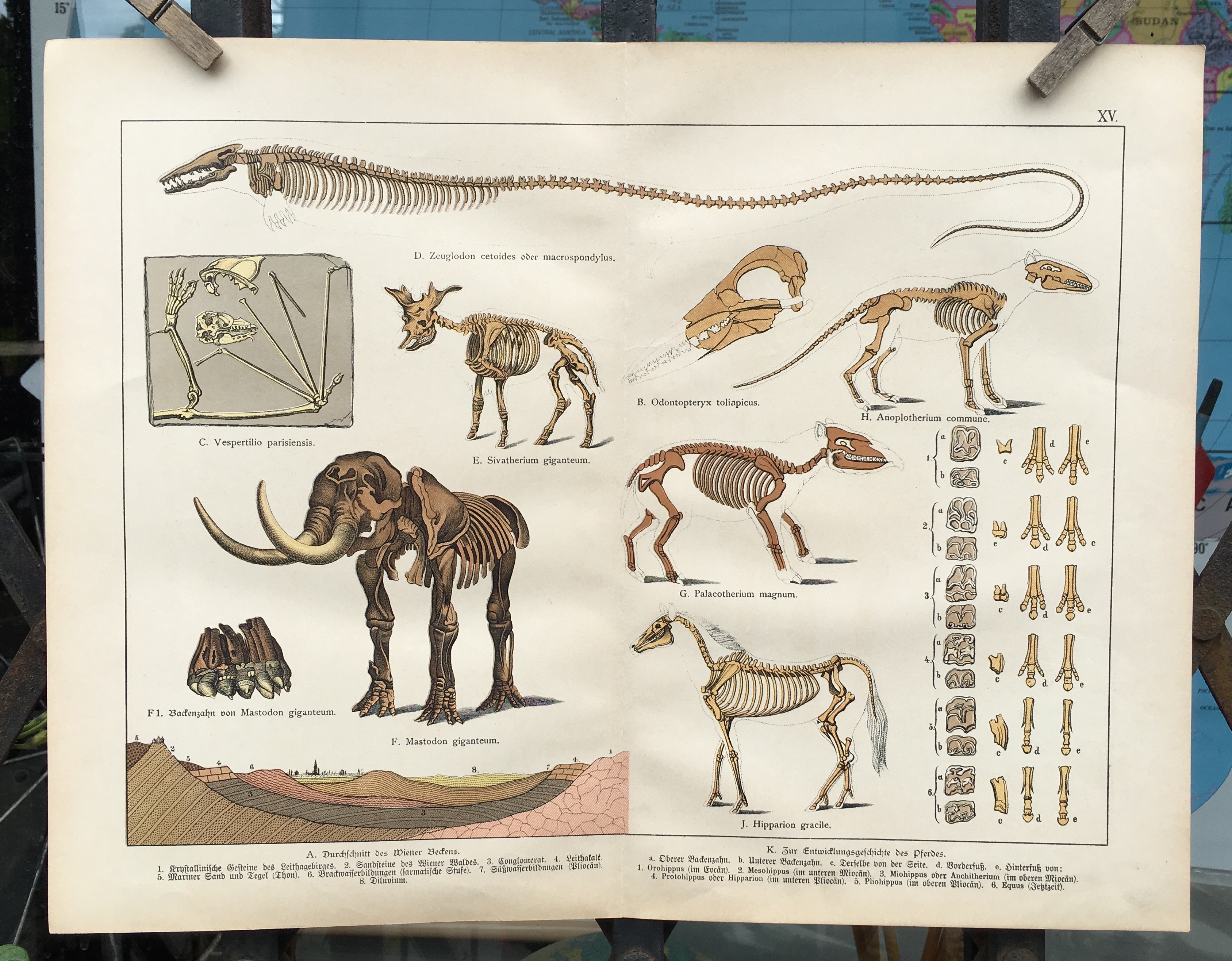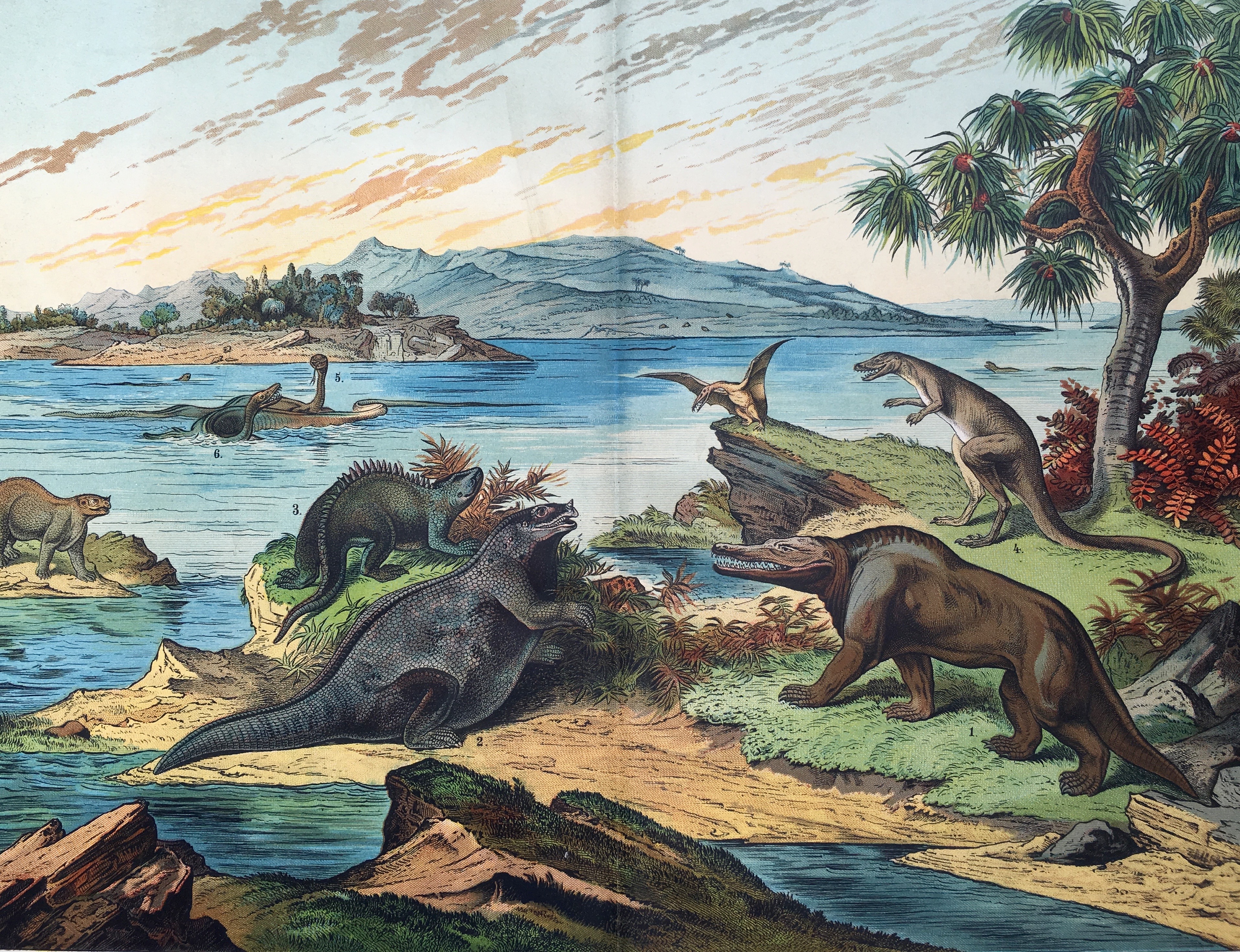 Next day, I was listening to WNYC (again..yes, I listen to it all day long while I'm working) and a guest was speaking about taking geological samples in the Chicxulub crater of the meteor that, most likely, ended the long age of the dinosaurs. I have, in stock, some really beautiful and large German chromolithographs of the Dinosaur Age.