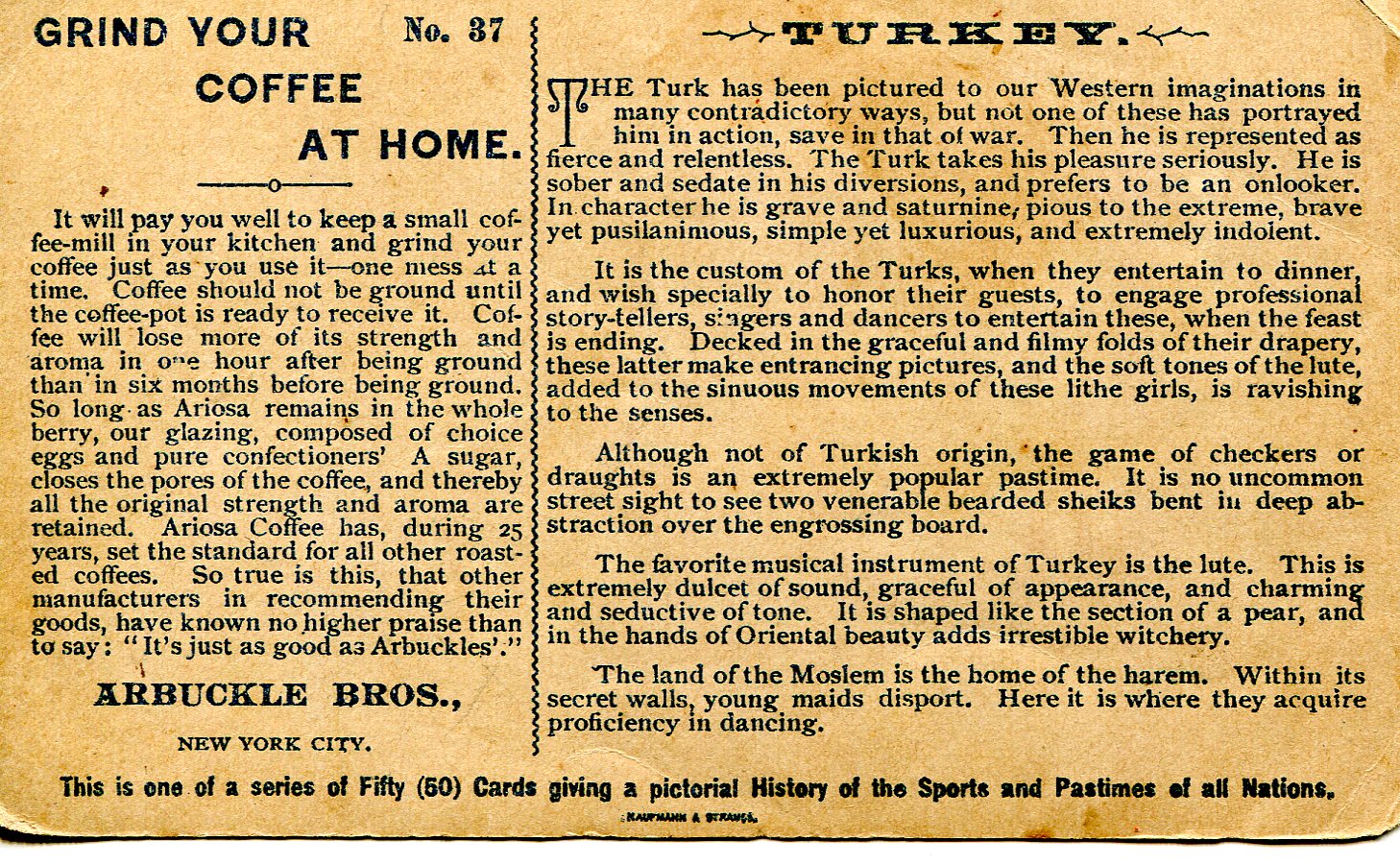 Some other examples of trade card-like advertising were quite elaborate. Some companies produced collectible series, such as Arbuckle Coffee's state cards.