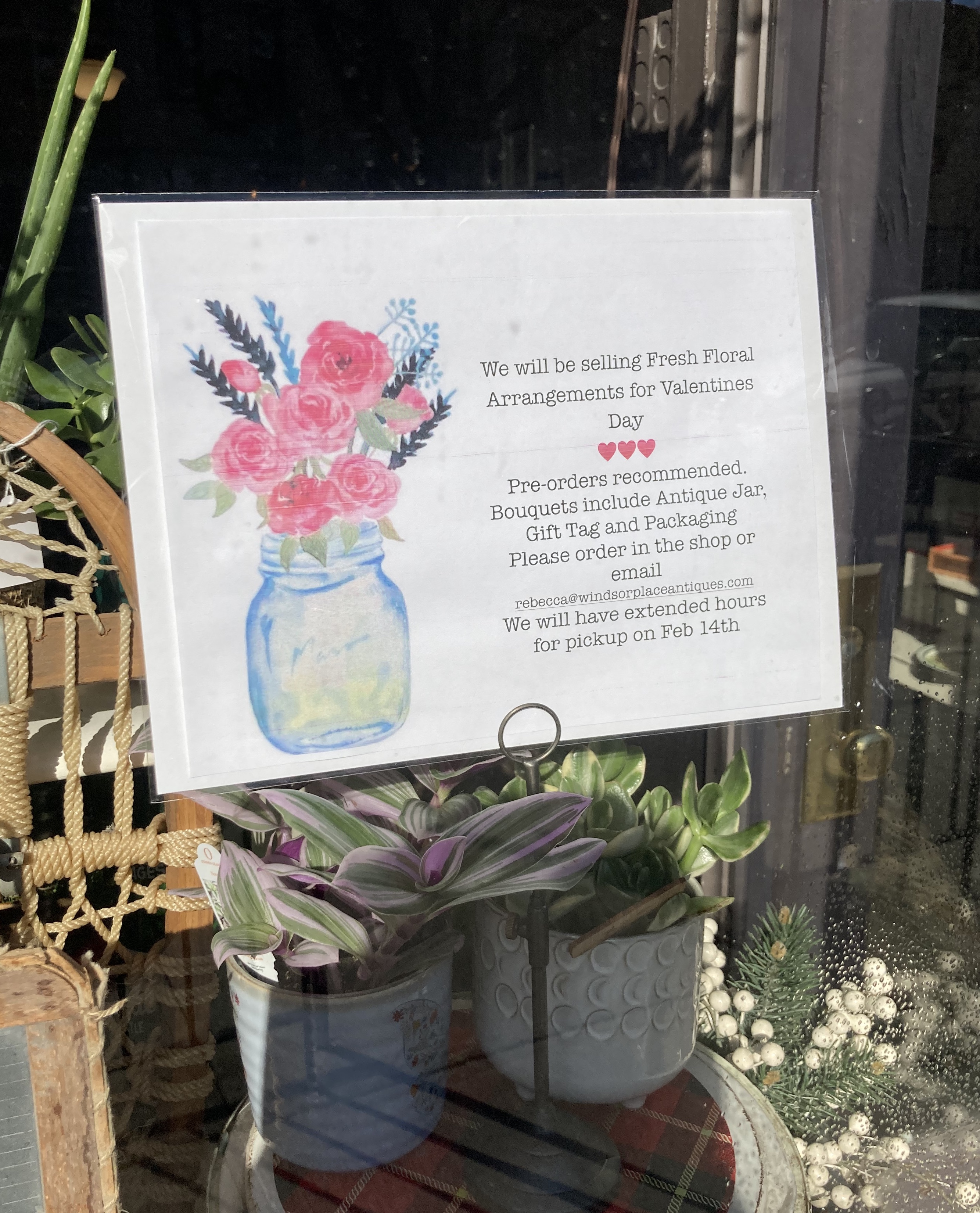 In other news: We will be selling fresh flower bouquets for Valentine’s Day this year. Pre-orders recommended and appreciated. Arrangements will be $50 and will include an antique blue mason jar, the best seasonal blooms we can source, a gift tag, and gift packaging. Pick up will be on Monday, February 13th from 5-7 pm or Tuesday, February 14th from 9-6.